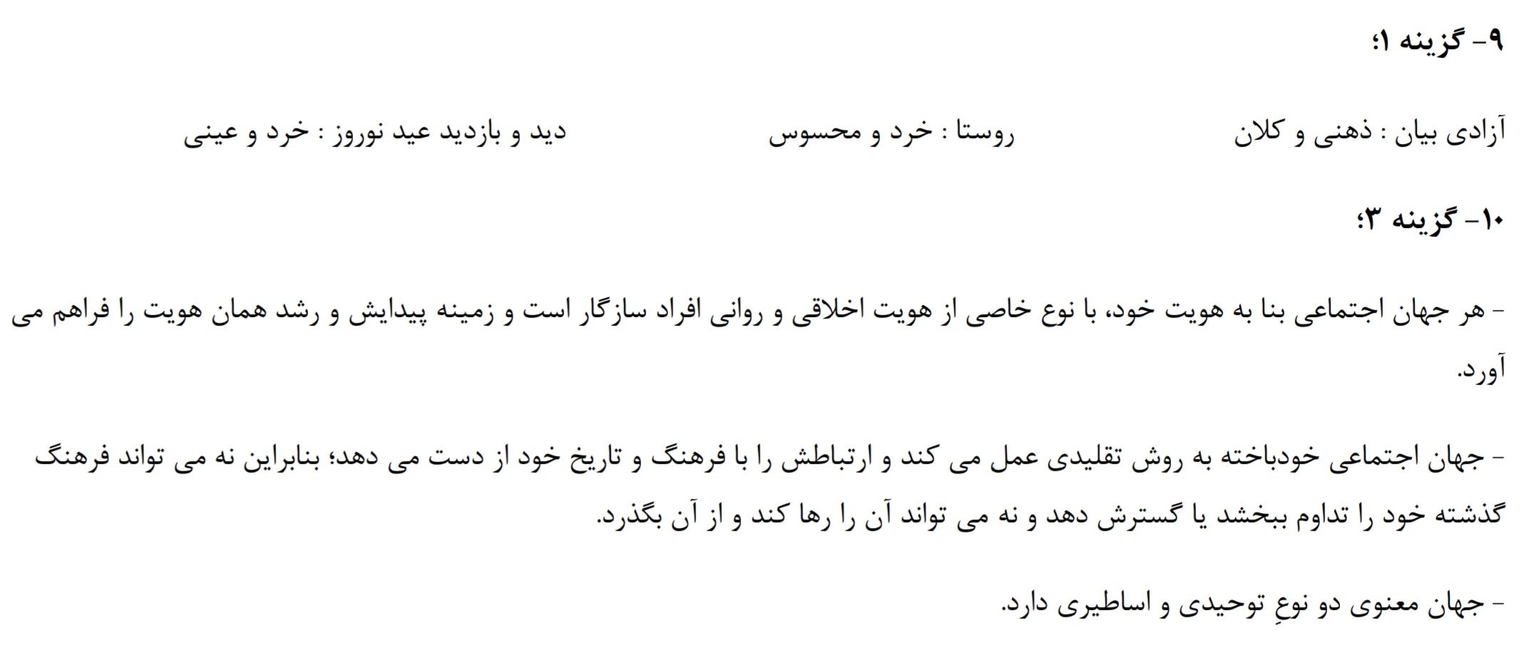 8- به ترتیب تفاوت هایی که به «عناصر محوری»، «لایه های سطحی جهان اجتماعی» و «ارزش های کلان» مربوط می شود، چه تاثیری در جهان اجتماعی ایجاد می کنند؟ (سراسری انسانی ۹۵)