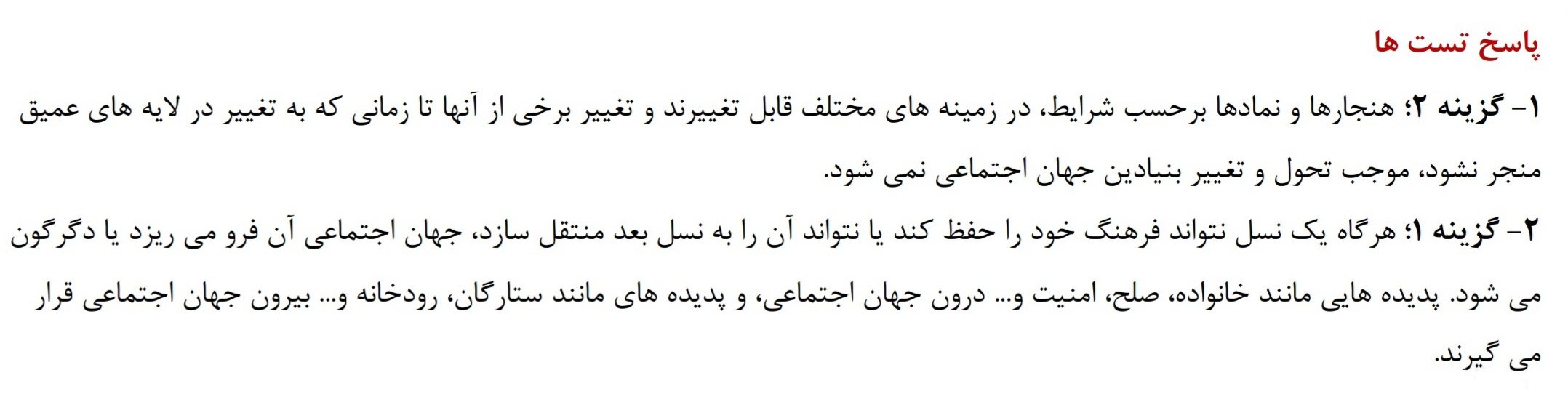2- ترتیب، کدام گزینه پیامد عدم حفظ یا انتقال فرهنگ به نسل های بعد است و صلح و ستارگان در کدام قسمت جهان اجتماعی قرار می گیرند؟ (آزمون کانون، ۵ آذر ۱۴۰۰)