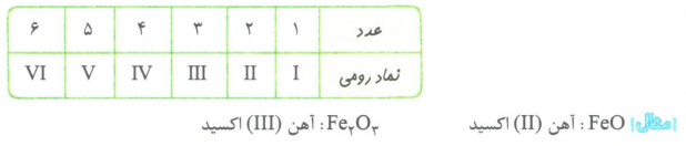 برخی از فلزها مانند آهن در واکنش با اکسیژن، دو نوع اکسید تولید می کنند. در واقع آهن با اکسیژن ترکیب و ابتدا به FeO تبدیل می شود. سپس این ترکیب با اکسیژن واکنش داده و به Fe2O3 اکسایش می یابد. برای نام گذاری ترکیب های فلزهایی مانند آهن که بیش از یک نوع کاتیون با بار متفاوت دارند، باید بار کاتیون با اعداد رومی داخل پرانتز داده شود.