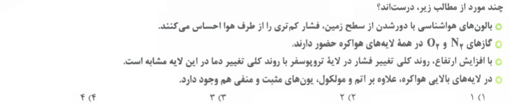 4- هرچه ارتفاع از سطح زمین بیشتر می شود، هواکره رقیق تر شده و غلظت آن کاهش می یابد، بنابراین می توان نتیجه گرفت که با افزایش ارتفاع، غلظت و فشار گاز های هواکره از جمله اکسیژن کمتر می شود. (البته درصد حجمی گازها تغییری نمی کند.)