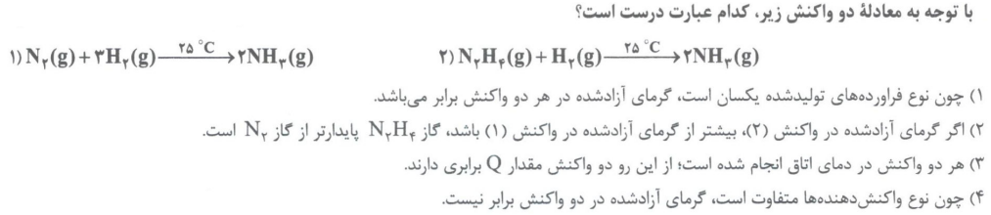 4- حالت فیزیکی واکنش دهنده ها و فرآورده ها: حالت فیزیکی مواد شرکت کننده در یک واکنش باید مشخص باشد، زیرا انرژی مواد در حالت های فیزیکی مختلف، متفاوت است. به طور کلی سطح انرژی یک ماده در حالت گاز بیشتر از حالت مایع و آن هم بیشتر از حالت جامد می باشد.