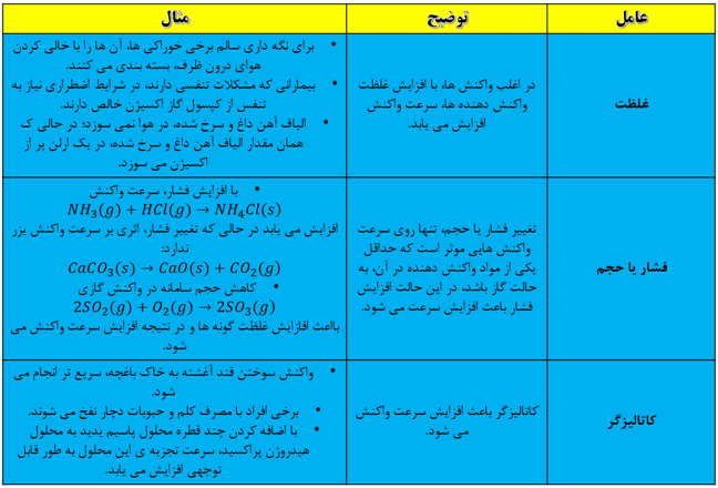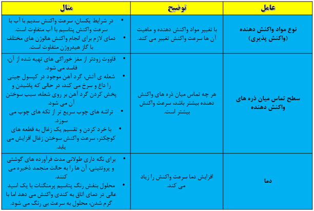 سرعت انجام واکنش به نوع مواد واکنش دهنده، سطح تماس واکنش دهنده ها، غلظت واکنش دهنده ها، دما و کاتالیزگر وابسته است.