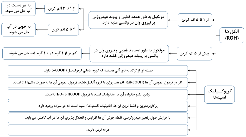 2- در کربوکسیلیک اسید ها نیز مانند، الکل ها، با افزایش طول زنجیر کربنی بخش ناقطبی بزرگتر می شود و قطبیت مولکول کاهش می یابد. در نتیجه انحلال پذیری آن ها در آب کم تر می شود.