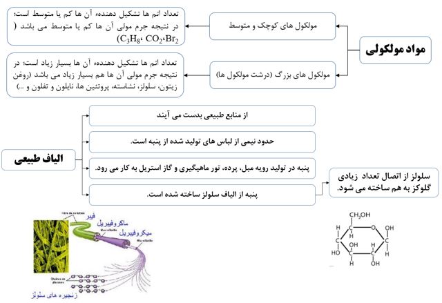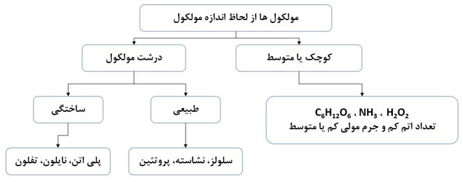 به ترکیبات مولکولی که تعداد اتم های آن ها به ده ها هزار می رسد درشت مولکول ها گفته می شود. مانند سلولز، نشاسته، پروتئین موجود در پشم، ابریشم، انسولین و ..... که درشت مولکول های طبیعی هستند و پلی اتن، پلی استر، نایلون، تفلون و .... که در طبیعت یافت نمی شوند و درشت مولکول های ساختگی می باشند.