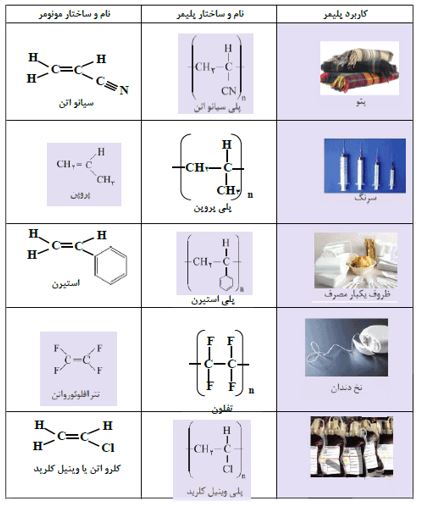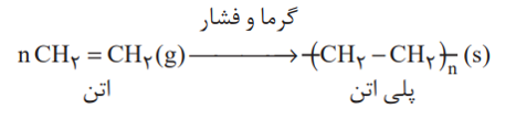 نکته: هر ترکیب آلی که در ساختارهای خود دارای پیوند دوگانه کربن – کربن (c=c) باشد، می تواند در واکنش های پلیمری شدن شرکت کند. به عنوان مثال گاز اتن (〖CH〗_(2 )=〖CH〗_2) را در فشار بالا گرم کنیم، جامد سفید رنگی پدید می آید که جرم مولی آن اغلب ده ها هزار گرم بر مول است و در ساختار آن هزاران اتم کربن و هیدروژن وجود دارد. به این فرآورده ها جامد پلی اتن گفته می شود.