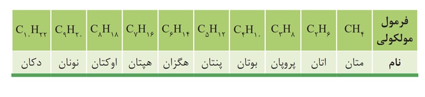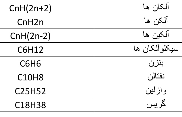 فرمول کلی هیدروکربن ها و فرمول چند ترکیب مهم :