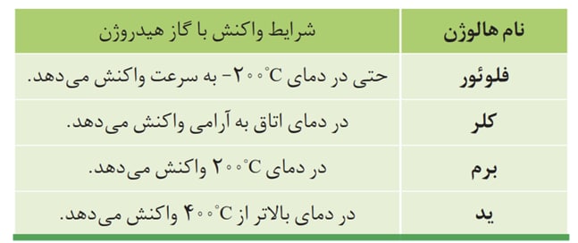 با توجه به شرایط واکنش هالوژن ها با گاز هیدروژن در جدول زیر میتوان گفت در گروه ۱۷ جدول تناوبی با افزایش عدد اتمی از خصلت نافلزی عناصر و شدت واکنش با هیدروژن (و همچنین با فلزات)کاسته میشود.