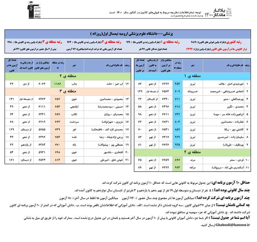 یادگار ماندگار : قبولی های کانونی دانشگاه علوم پزشکي اروميه ، دانشگاه ارومیه و دانشگاه صنعتی ارومیه و دانشگاه آزاد ارومیه در همه رشته ها در سال 1400 را در ادامه مشاهده کنید.