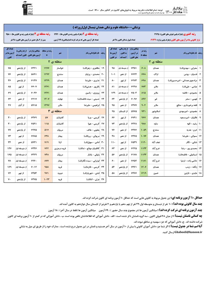 یادگار ماندگار : قبولی های کانونی دانشگاه بوعلي سينا همدان و دانشگاه علوم پزشکی همدان در همه رشته ها در سال 1400 را در ادامه مشاهده کنید.فایل با کیفیت قبولی های سال 1400 را در قسمت فایل های ضمیمه دانلود کنید.