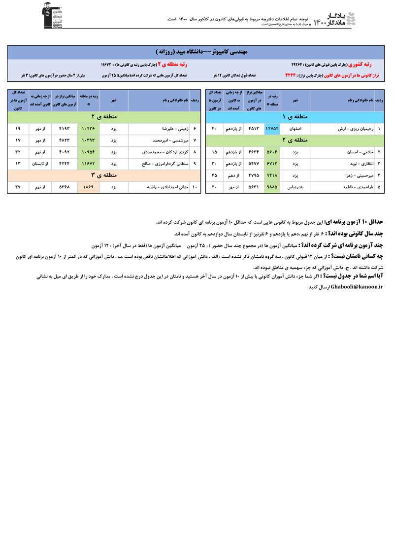 یادگار ماندگار : قبولی های کانونی دانشگاه میبد در همه رشته ها در سال 1400 را در ادامه مشاهده کنید.فایل با کیفیت قبولی های سال 1400 را در قسمت فایل های ضمیمه دانلود کنید.