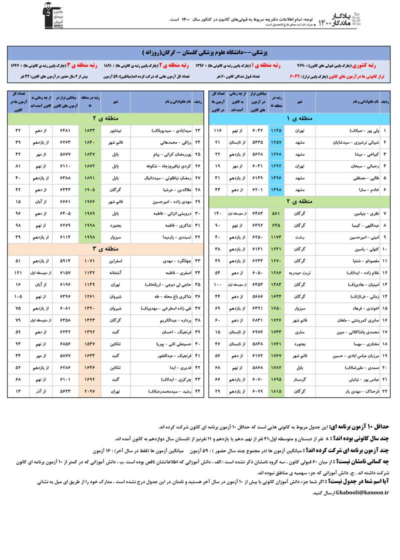 یادگار ماندگار : قبولی های کانونی دانشگاه علوم پزشکی گرگان و دانشگاه گلستان - گرگان در همه رشته ها در سال 1400 را در ادامه مشاهده کنید.فایل با کیفیت قبولی های سال 1400 را در قسمت فایل های ضمیمه دانلود کنید.