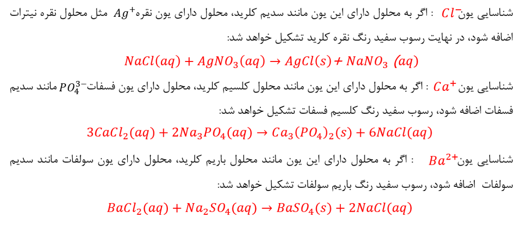 است. برخی از یون ها به طور طبیعی در آب حل شده اند و برخی دیگر مانند یون فلوئورید، در مراکز تأمین آب آشامیدنی سالم، به آب افزوده می شوند. وجود مقدار بسیار کم یون فلوئورید در آب آشامیدنی باعث حفظ سلامت دندان ها می شود و آب باران در هوای پاک تقریبا خالص است؛ زیرا هنگام تشکیل برف و باران، تقریبا همه مواد حل شده در آب، از آن جدا می شوند. این فرایند الگویی برای تهیه آب خالص است که به آن فرایند «تقطیر» و فراورده حاصل از آن را «آب مقطر» می گویند. و یکی از روش های شناسایی یون ها در آب یا محلول حاوی این یون ها، اضافه کردن محلول یک ترکیب یونی دیگر به آنهاست؛ به طوری که با یون موردنظر ما رسوب (ماده نامحلول) تشکیل دهد.