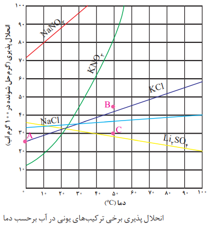 نکته: در این نمودار، نقاط روی منحنی نشان دهنده محلول سیر شده، نقاط زیر منحنی نشان دهنده محلول سیر نشده و نقاط بالای منحنی نشان دهنده محلول فراسیر شده است.