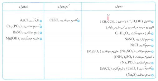 نکته: آب و اتانول در هر نسبتی در آب حل می شوند و نمی توان محلول سیر شده از آن ها تهیه کرد.