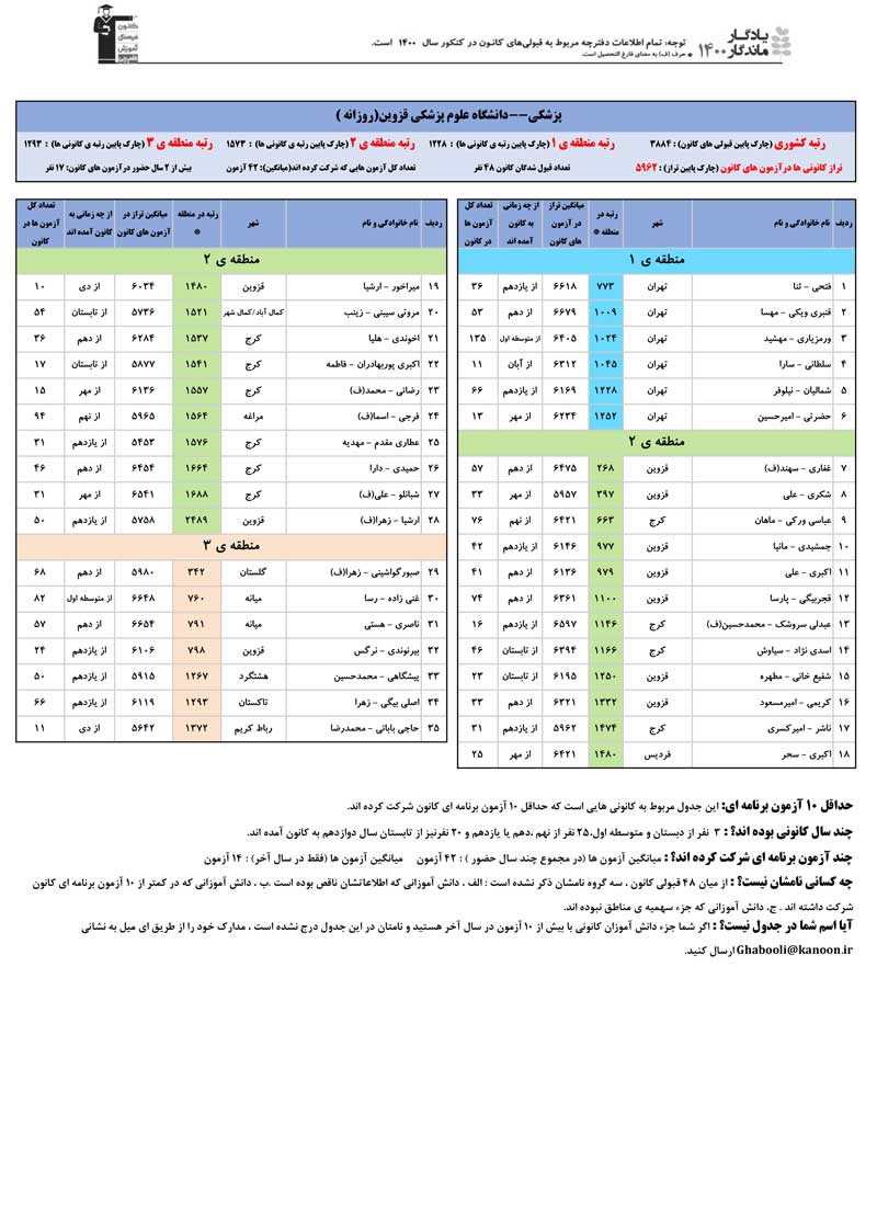 یادگار ماندگار : قبولی های کانونی دانشگاه بین اللملی امام خميني قزوين و دانشگاه علوم پزشکي قزوين در همه رشته ها در سال 1400 را در ادامه مشاهده کنید.فایل با کیفیت قبولی های سال 1400 را در قسمت فایل های ضمیمه دانلود کنید.