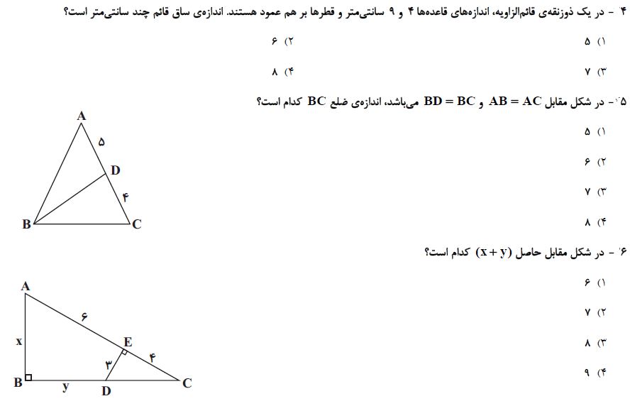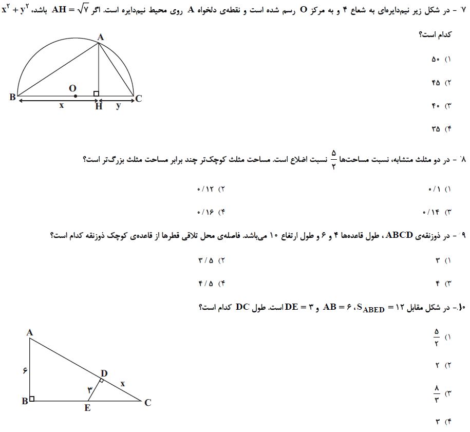 10 سوال هندسه دهم که در ادامه برای شما قرار دادیم، جمع بندی مباحث آزمون 7 بهمن بوده و برای آمادگی بیشتر شما در این آزمون توسط فاطمه احدزاده رتبه 373 رشته ریاضی سال 95 انتخاب و برای شما قرار داده شده است. بعد از مطالعه ی کتاب درسی و درسنامه های آمادگی آزمون 7 بهمن، توصیه میکنم حتما این سوالات را حل کرده و جواب های خود را با پاسخنامه بررسی کنید.