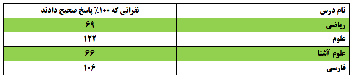 و اما تعداد دانشآموزانی که هر درس را 100% پاسخ درست دادند: