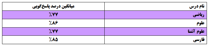 میانگین درصدهای پاسخ گویی این آزمون نسبت به آزمونهایی که حجم مطالب کمتر است، پایینتر میباشد. به نظر میرسد بخشی از مطالبی که دانش آموزان در ابتدای سال یادگرفتند و کمی از آن فاصله گرفتند را فراموش کردند و این آزمون کمکی برای یادآوری و بازیابی این مطالب بود.