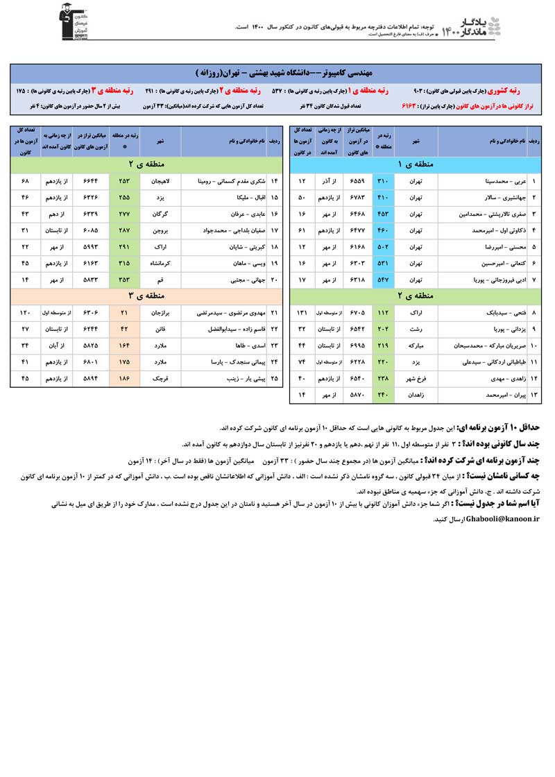 یادگار ماندگار : قبولی های کانونی دانشگاه شهید بهشتی تهران در همه رشته ها در سال 1400 را در ادامه مشاهده کنید.فایل با کیفیت قبولی های سال 1400 را در قسمت فایل های ضمیمه دانلود کنید.