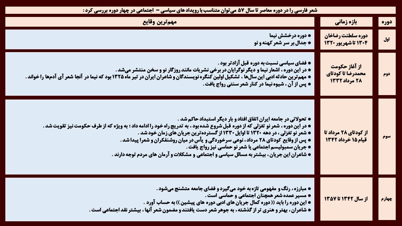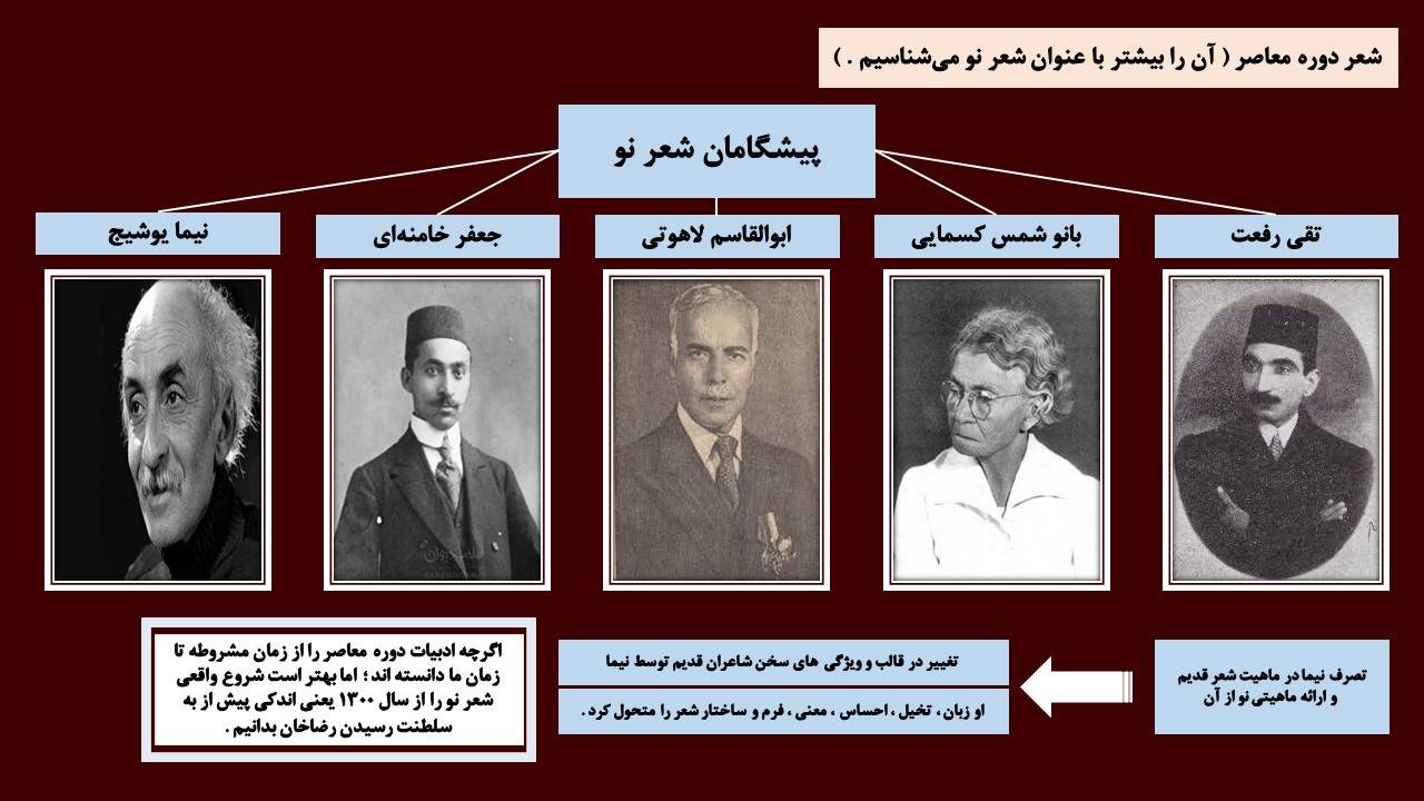 ⚪ پیدایش شعر معاصر ایران و گسترش آن با رویداد هایی مانند انقلاب مشروطیت ، پایان سلسله قاجار و سلطنت رضاشاه همراه بود .