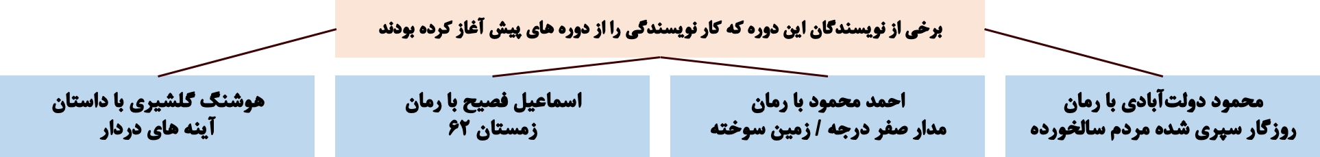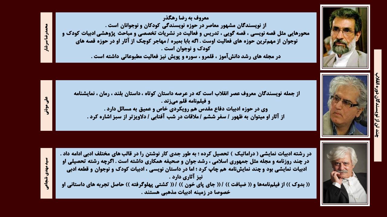 ⚪ اغلب نویسندگان موفق در این دوره ، پیشکسوتان و کسانی هستند که تجربه نویسندگی سال های قبل از انقلاب را دارند ؛ آنان از طریق دانستن زبان بیگانه یا خواندن ترجمه داستان های خارجی ، ارتباط خود را با پیشرفت های جهانی این فن حفظ کرده و تجربیات نوینی را که تحولات سیاسی اجتماعی به آنها داده ، به صورت داستان عرضه کرده اند .