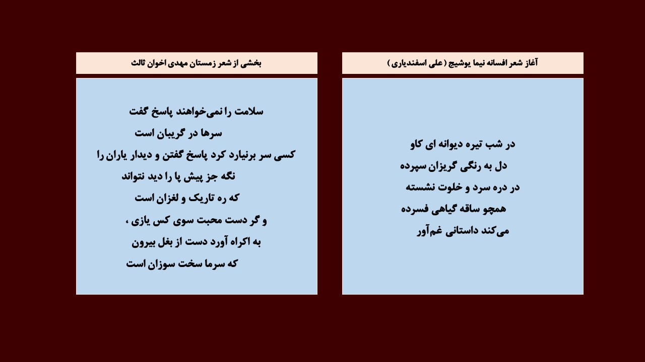 ⚪ نیما در این مسیر از واژگان روزمره ، عامیانه و نو بهره برد و از نوآوری و بکار گرفتن ترکیب های تازه نهراسید .