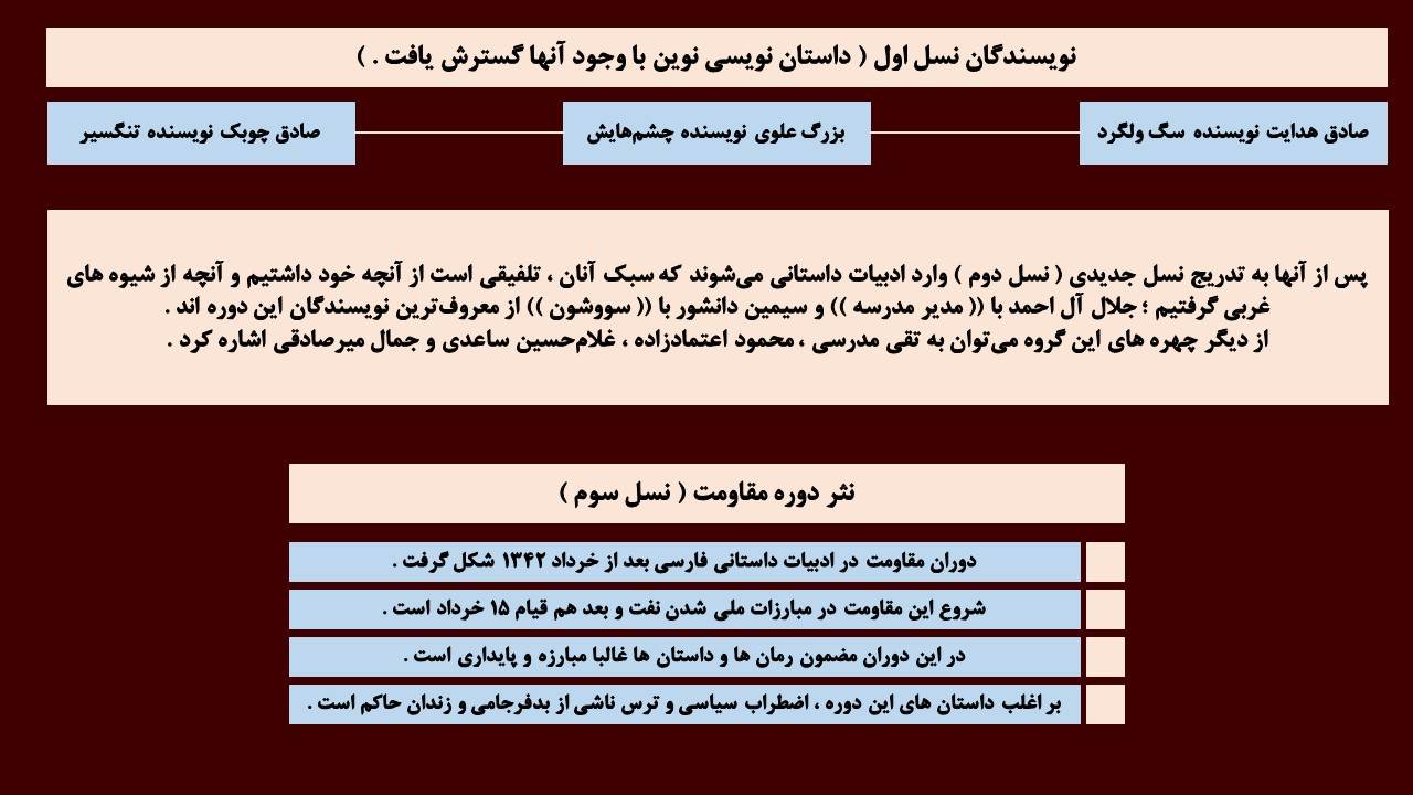 ⚪ نثر این دوره به ویژه در داستان نویسی ادامه مییابد و تجربه های بدیع و کم سابقه ای در کنار دیگر مضامین فلسفی و اجتماعی مورد توجه نویسندگان قرار میگیرد .