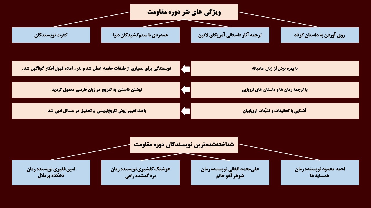 4. آثار او مربوط به داستان های دوره مقاومت است .