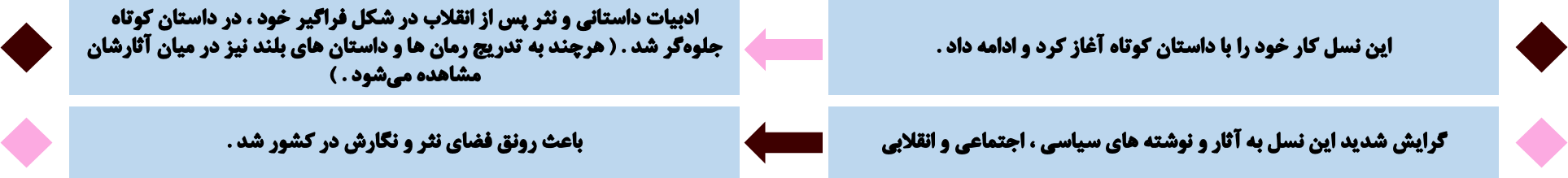 ⚪ نسل جوان انقلاب هنوز مهارت کافی برای بیان تجربه های ادبی خود نداشت . لازمه کسب چنین مهارتی ، تأمل در آثار قدما و آشنایی با ادبیات جهان بود .