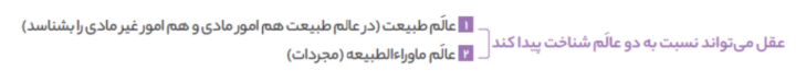 • انسان با قوه ی عقل ، تفکر و تعقل می کند و حقایقی را درمی یابد که با حواس نمی تواند به آنها پی ببرد . در واقع عقل ، قلمرو معرفتی گسترده تری از حس دارد . حقایقی را که عقل درک می کند ، شامل : الف) امور محسوس و طبیعی (مادیات) ب) امور نامحسوس و غیر طبیعی (مجردات) می باشد .