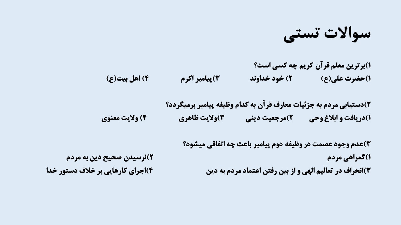 1)گزینه3: پیامبر اکرم برترین معلم قرآن است ولی حضرت علی برترین کاتب و حافظ قرآن است.