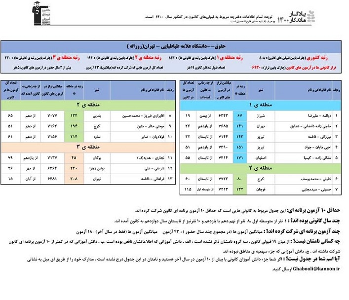 یادگار ماندگار : قبولی های کانونی دانشگاه علامه طباطبایی تهران در همه رشته ها در سال 1400 را در ادامه مشاهده کنید.فایل با کیفیت قبولی های سال 1400 را در قسمت فایل های ضمیمه دانلود کنید.
