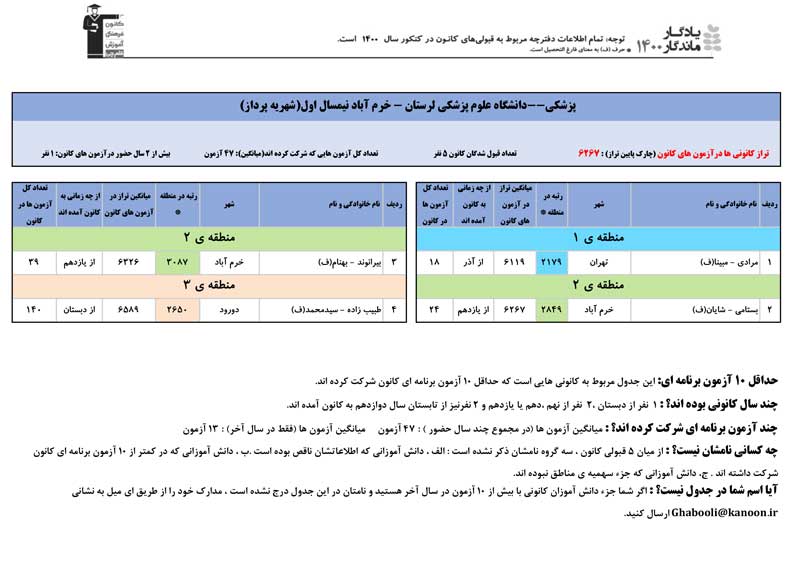 یادگار ماندگار : قبولی های کانونی دانشگاه علوم پزشکی لرستان - خرم آباد و دانشگاه لرستان - خرم آباد در همه رشته ها در سال 1400 را در ادامه مشاهده کنید.فایل با کیفیت قبولی های سال 1400 را در قسمت فایل های ضمیمه دانلود کنید.