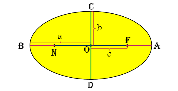 محورها: خط گذرنده از کانون های بیضی( F و N ) را محور کانونی و عمود منصف پاره خط FN را محور ناکانونی بیضی می نامند. محورهای بیضی، محورهای تقارن آن هستند.
