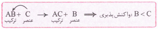 در معادله کلی بالا، واکنش پذیری Cاز Bبیشتر بوده است؛ به همین دلیل میل بیشتری به تشکیل ترکیب داشته؛ از این رو با انجام واکنش، جاشو باB عوض می کند.