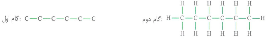 توجه: برای رسم ساختار آلکان های راست زنجیر مانند هگزان (C6H6) می توان به تعداد اتم های کربن موجود در فرمول، اتم های C را با پیوند یگانه به هم وصل کرد و تا رسیدن به 4 پیوند برای هر اتم کربن، به آن ها اتم های هیدروژن متصل کرد. به طور مثال در این جا خواهیم داشت: