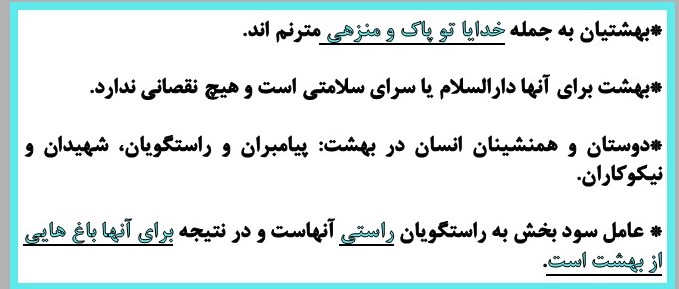 1)برای آنها باغ هایی از بهشت است. 2)امانت ها و عهد های خود را رعایت میکنند.