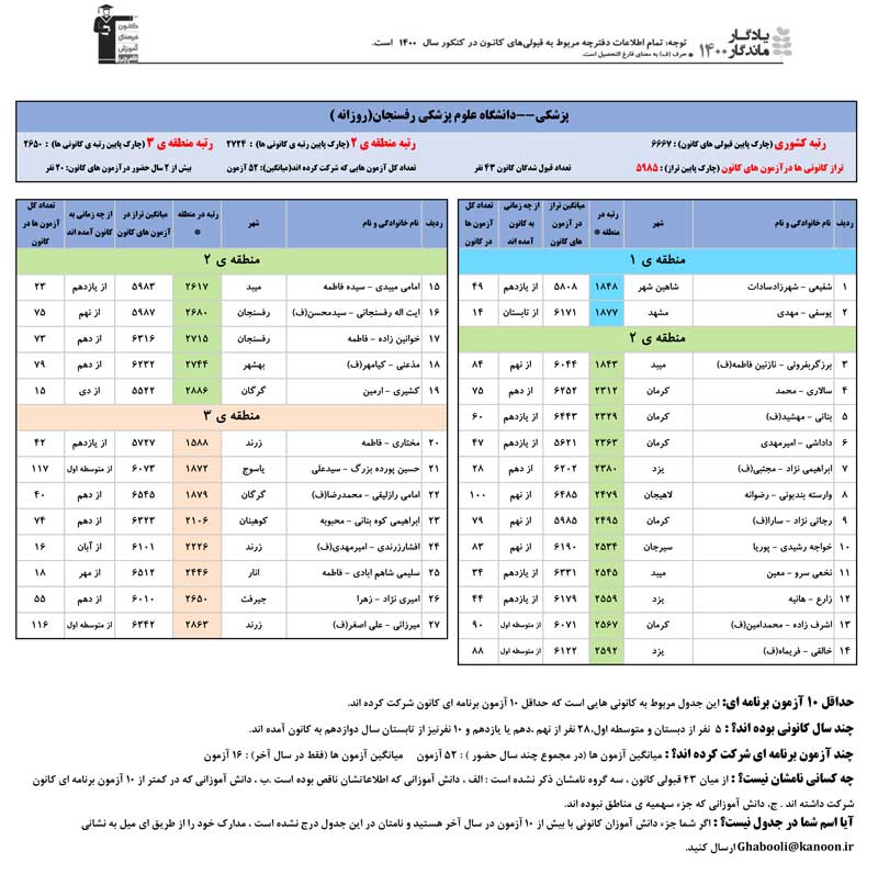 یادگار ماندگار : قبولی های کانونی دانشگاه علوم پزشکی رفسنجان و دانشگاه ولي عصر رفسنجان و دانشگاه حضرت نرجس(س)-رفسنجان در همه رشته ها در سال 1400 را در ادامه مشاهده کنید.