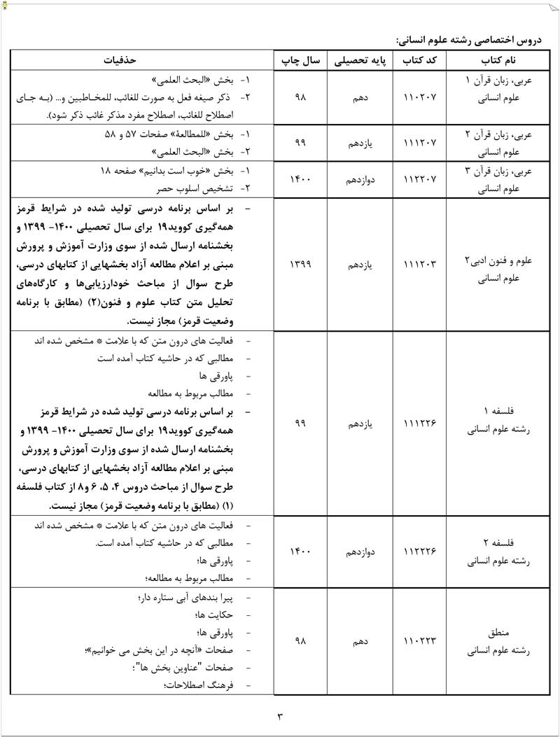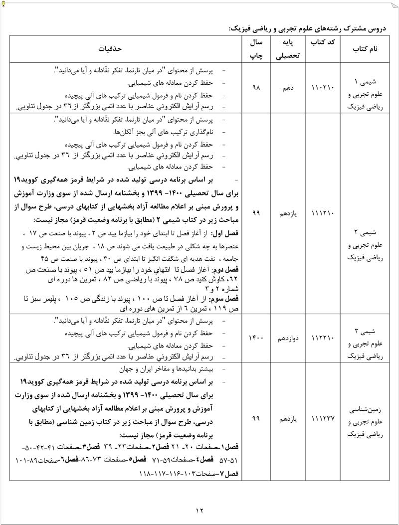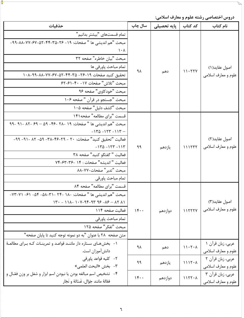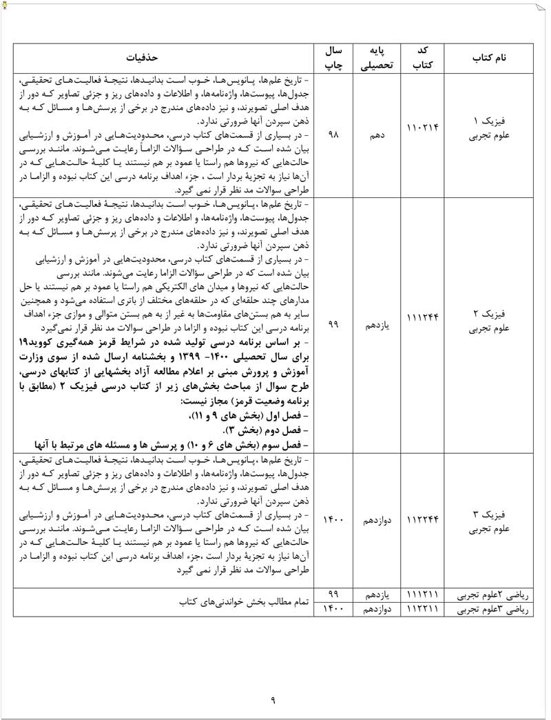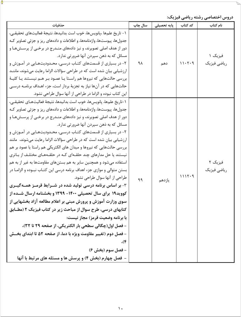 اطلاع متقاضیان آزمون سراسري سال 1401 ميرساند براساس نامه های شماره 17970/1/101 مورخ 1400/10/29 و شماره 18443 مورخ 1400/11/06 سازمان پژوهش و برنامهریزی آموزشی وزارت آموزش و پرورش، فهرست حذفیات منابع آزمون سراسری سال 1401 که از آن سؤال طرح نخواهد شد در فایل ضمیمه زیر قابل مشاهده و دریافت است.