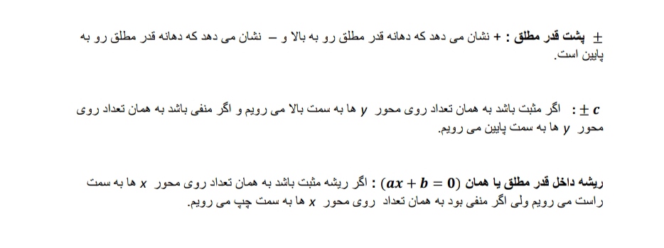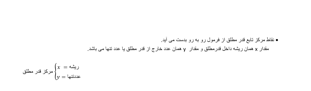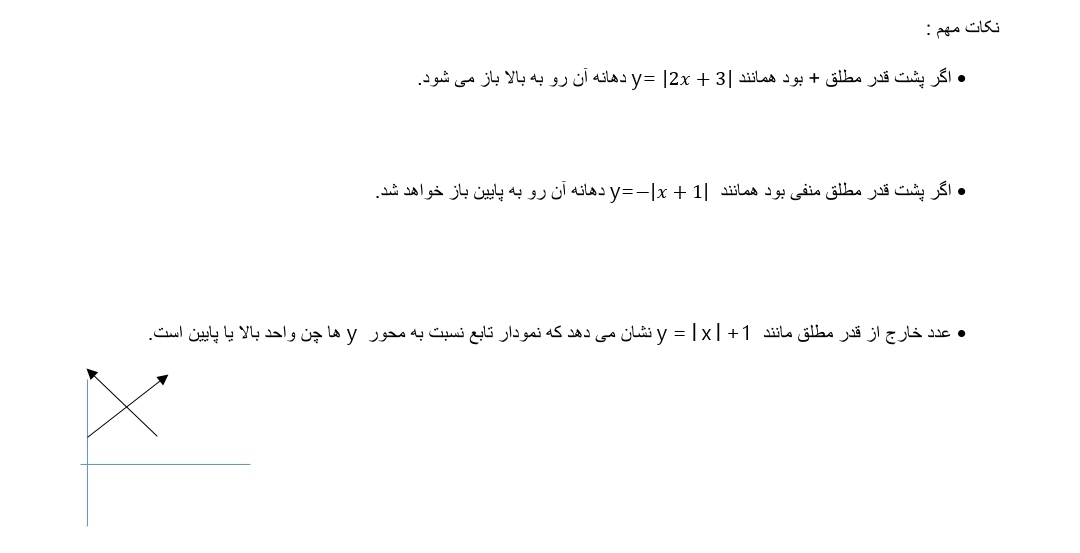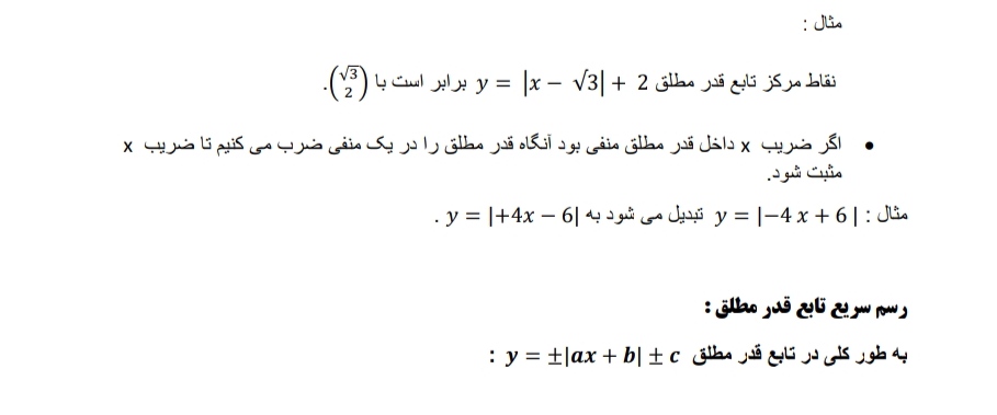 - برای اعداد بزرگتر و مساوی ریشه خود ضابطه را درنظر می گیریم و برای اعداد کوچکتر از ریشه قرینه ضابطه داخل قدرمطلق را در نظر می گیریم.