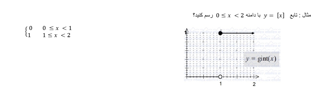 برای رسم آن باید دامنه تابع را که همیشه هم به ما داده می شود به قسمت های کوچکتری تقسیم کنیم.در واقع با این کار، تابع براکتی را به یک تابع چند ضابطه ای تبدیل می کنیم.