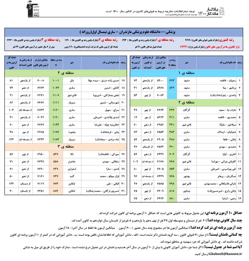 یادگار ماندگار : قبولی های کانونی دانشگاه علوم پزشکی مازندران - ساری و دانشگاه علوم کشاورزي ساري در همه رشته ها در سال 1400 را در ادامه مشاهده کنید.فایل با کیفیت قبولی های سال 1400 را در قسمت فایل های ضمیمه دانلود کنید.