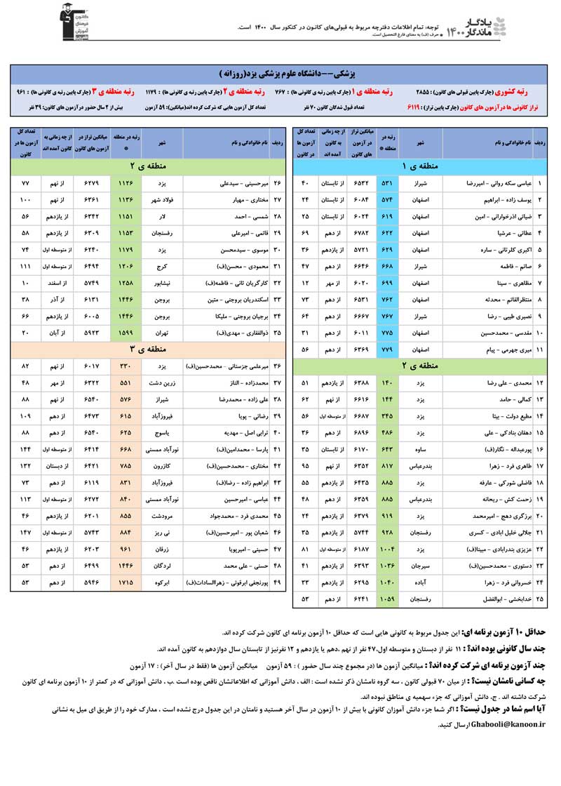 یادگار ماندگار : قبولی های کانونی دانشگاه علوم پزشکی یزد و دانشگاه یزد در همه رشته ها در سال 1400 را در ادامه مشاهده کنید.فایل با کیفیت قبولی های سال 1400 را در قسمت فایل های ضمیمه دانلود کنید.