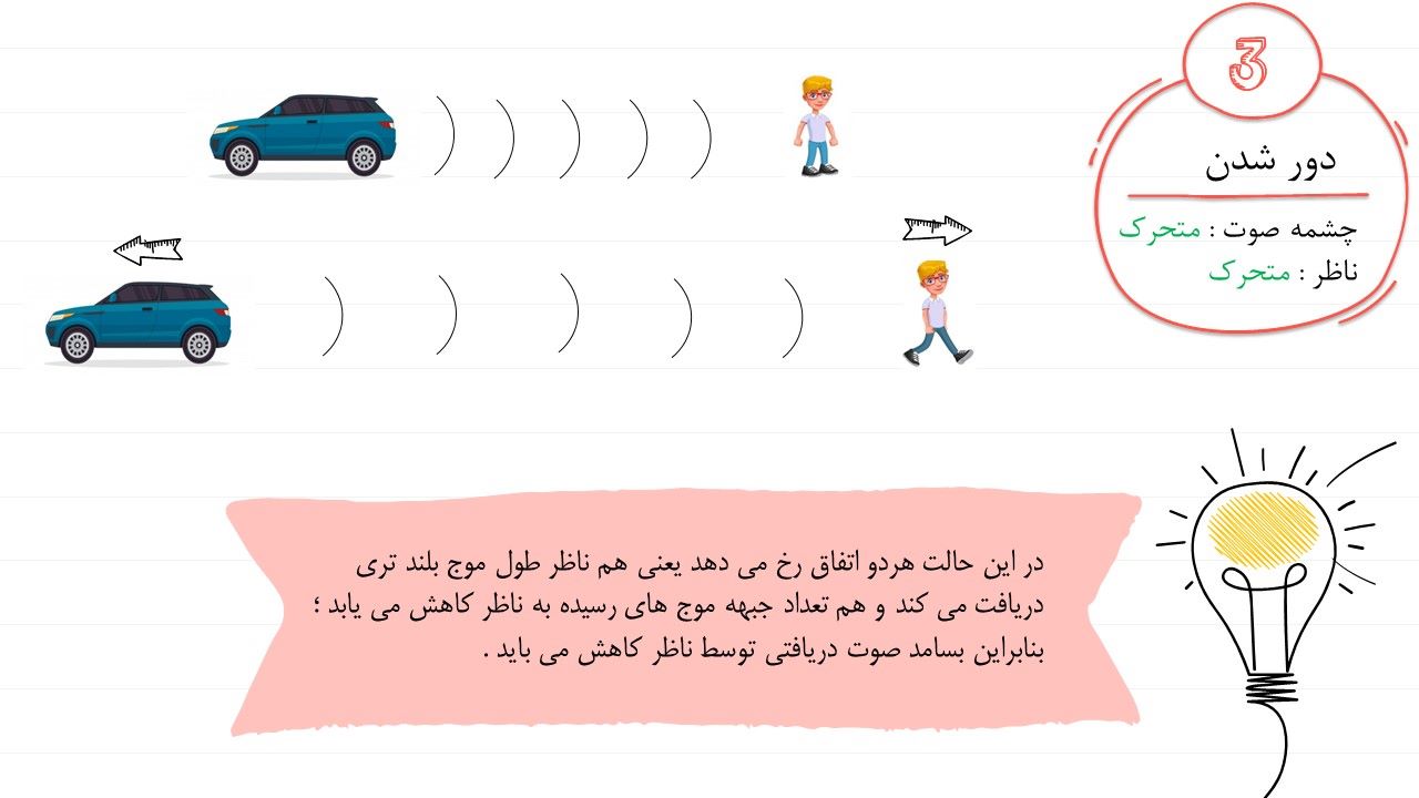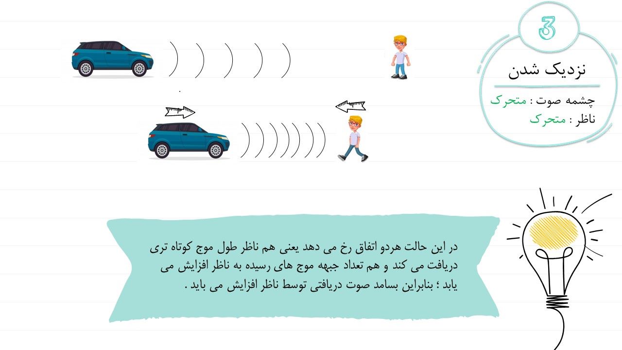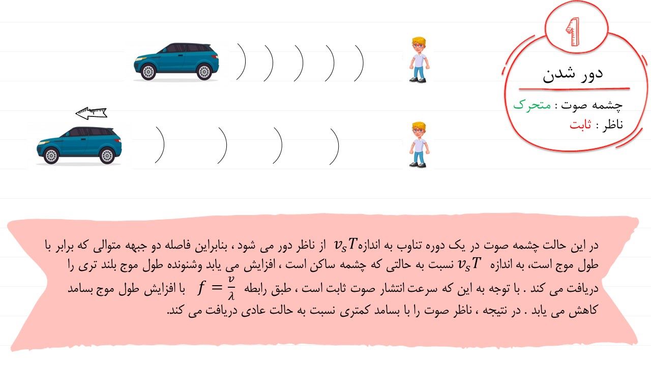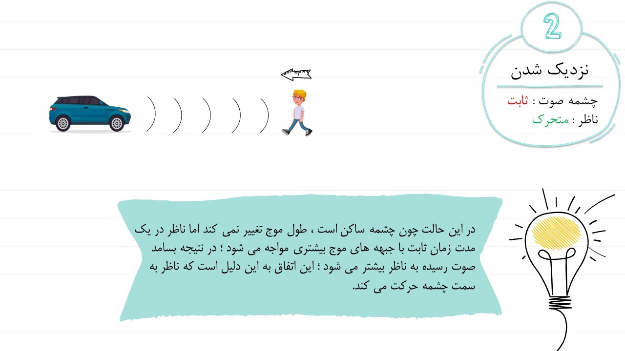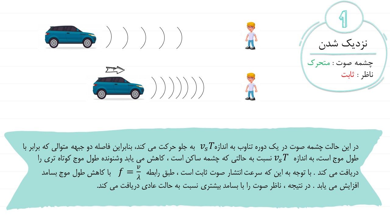 ت ) تندی انتشار صوت در جلوی چشمه نسبت به یک ناظر ساکن بزگتر از تندی انتشار صوت در عقب چشمه است.