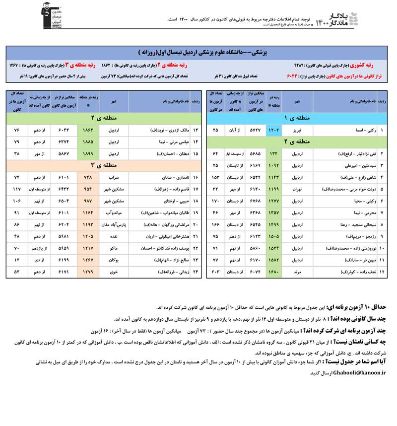 یادگار ماندگار : قبولی های کانونی دانشگاه علوم پزشکی اردبیل و دانشگاه محقق اردبيلي اردبيل در همه رشته ها در سال 1400 را در ادامه مشاهده کنید.فایل با کیفیت قبولی های سال 1400 را در قسمت فایل های ضمیمه دانلود کنید.
