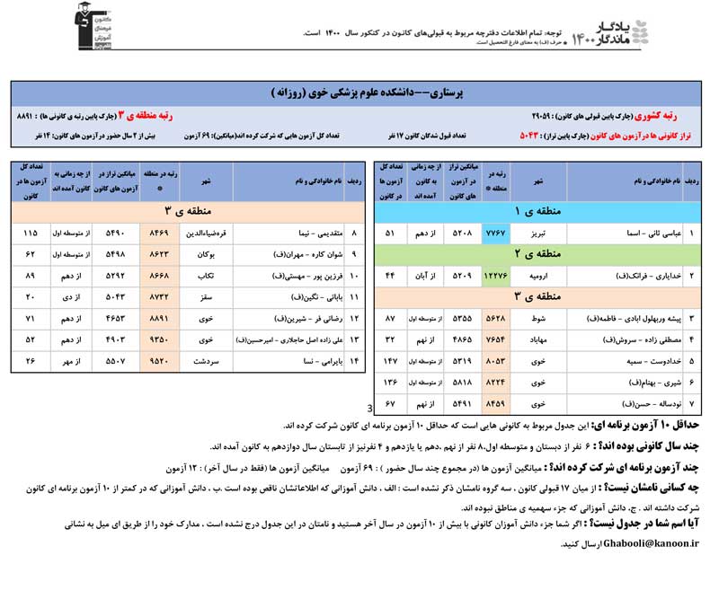 یادگار ماندگار : قبولی های کانونی دانشگاه علوم پزشکی خوی در همه رشته ها در سال 1400 را در ادامه مشاهده کنید.فایل با کیفیت قبولی های سال 1400 را در قسمت فایل های ضمیمه دانلود کنید.