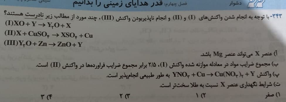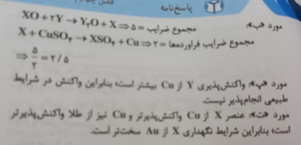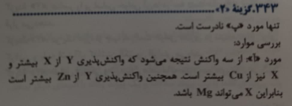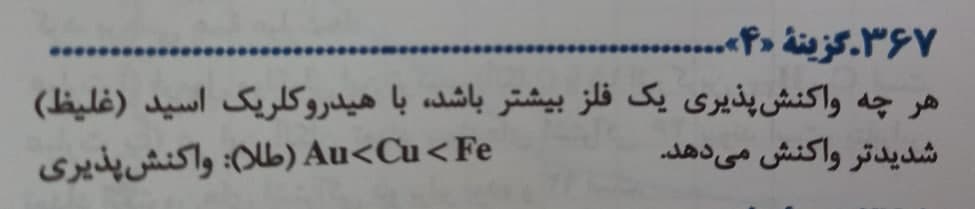 4-به طور کلی در هر واکنش شیمیایی که به طور طبیعی انجام می شود واکنش پذیری فرآورده ها از واکنش دهنده ها کمتر است.بنابراین اگر واکنشی داده شود که در دو سمت آن عنصر آزاد وجود داشته باشد و انجام شدن یا نشدن آن(به طور طبیعی)خواسته شود,کافی است واکنش پذیری دو عنصر آزاد در دو سمت معادله مقایسه شود.اگر واکنش پذیری عنصر سمت چپ بیشتر باشد,واکنش به طور طبیعی انجام پذیر است,در غیر این صورت,واکنش به طور طبیعی انجام نمی شود.