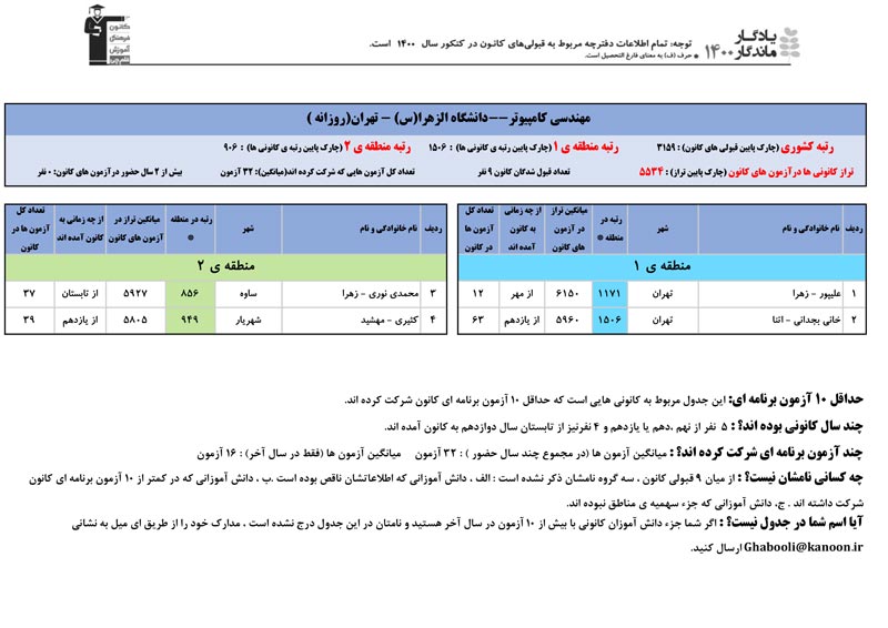 یادگار ماندگار : قبولی های کانونی دانشگاه الزهرا در همه رشته ها در سال 1400 را در ادامه مشاهده کنید.فایل با کیفیت قبولی های سال 1400 را در قسمت فایل های ضمیمه دانلود کنید.