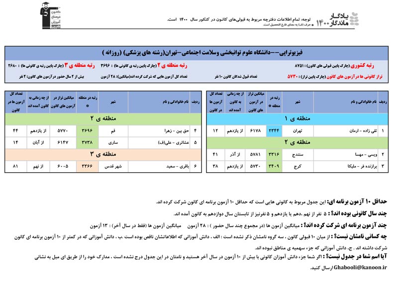 یادگار ماندگار : قبولی های کانونی دانشگاه علوم توانبخشی در همه رشته ها در سال 1400 را در ادامه مشاهده کنید.فایل با کیفیت قبولی های سال 1400 را در قسمت فایل های ضمیمه دانلود کنید.