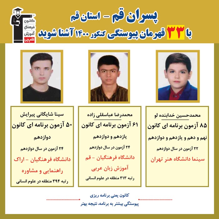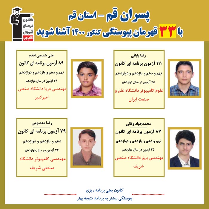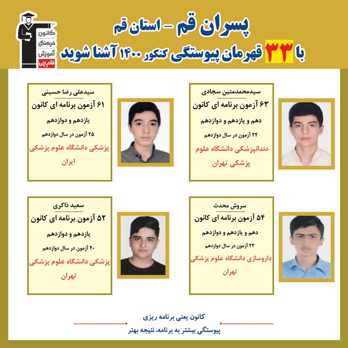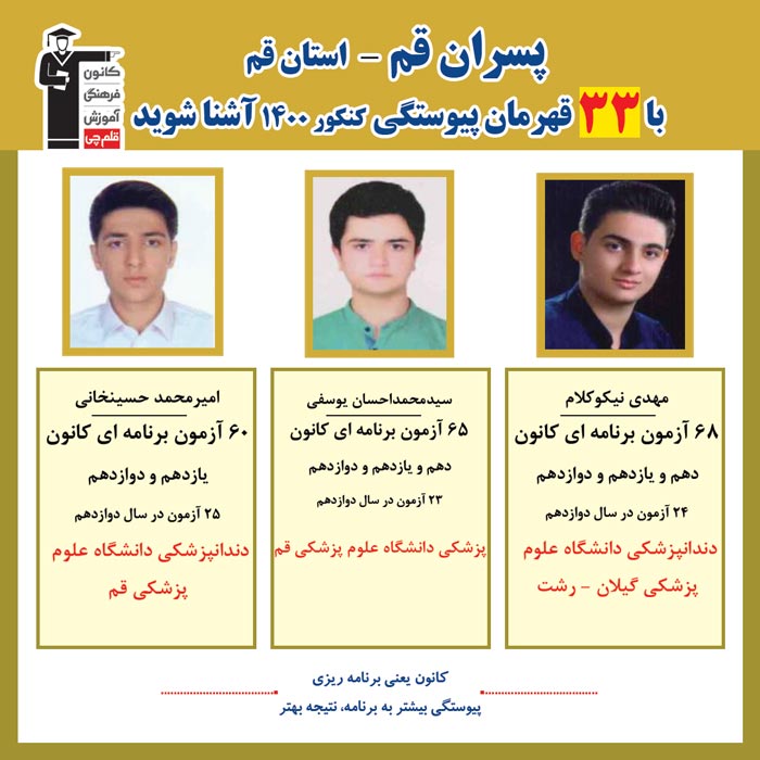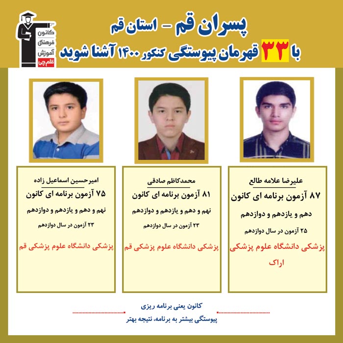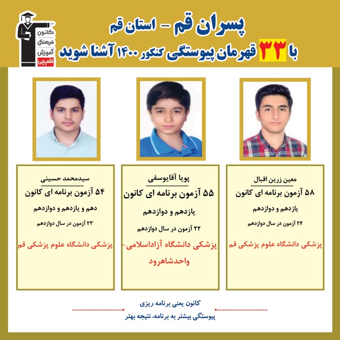 با 33 نفر قهرمانان پیوستگی پسران قم درکنکور 1400 آشنا شوید
